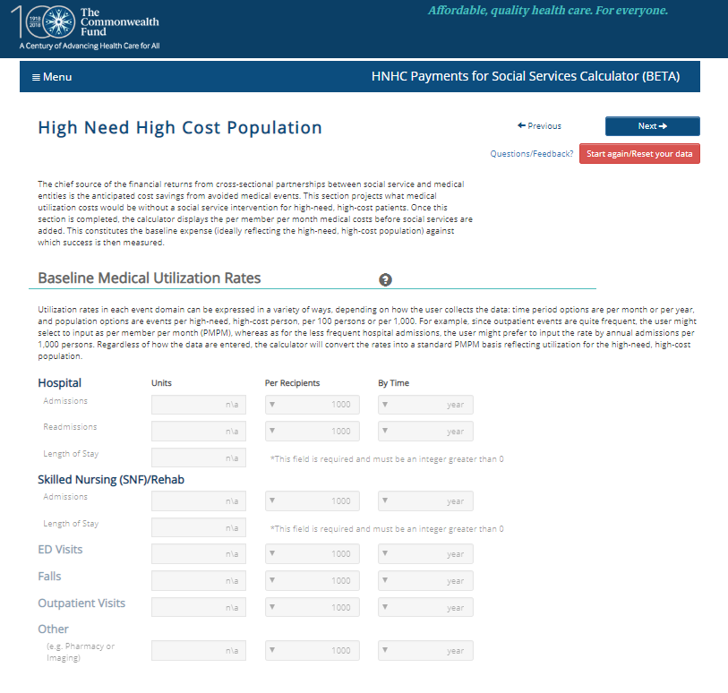 The second tool is the ROI Calculator, created by Victor Tabbush, professor emeritus of the UCLA Anderson School of Management. It is designed to help health care organizations and their community partners forge mutually beneficial financial arrangements to fund the delivery of nonmedical services. The tool calculates the return on investment (ROI) from such partnerships and shows how the financial returns and risks can be shared under a variety of payment arrangements (e.g., fee-for-service, capitation, or gainsharing).
