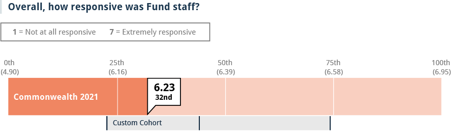 To understand grantees’ perception of the Fund as a grantmaker and identify ways to improve, the Fund partnered with the Center for Effective Philanthropy (CEP). In the fall of 2021, CEP sent a confidential survey to 181 Fund grantees with active grants in 2020 (104 grantees responded, yielding a 57% response rate). We compared results to more than 300 funders and a cohort of 10 peer foundations. We reviewed and discussed results internally and held meetings to discuss grantee feedback and identify next steps.