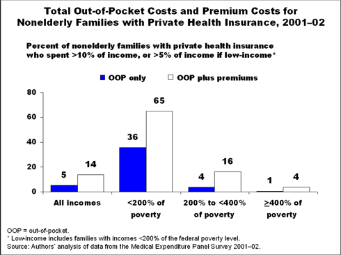 The researchers defined high health care costs as equal to 10% or more of income for all families, or 5% or more of income for a low-income family (below 200% of the federal poverty level). Out-of-pocket costs are defined as deductibles, coinsurance or copayments, and payments for services not covered by insurance. Family health care costs are defined as out-of-pocket costs for health services plus premiums paid by families (including single individuals).