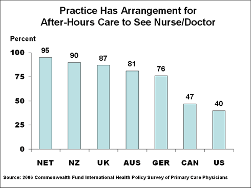 Primary care doctors in the U.S. (40%) were least likely to say that their practice had arrangements for after-hours care to see a nurse or doctor without going to an emergency room, and about half (47%) of Canadian primary care doctors have such arrangements. In contrast, almost all primary care doctors in the Netherlands (95%), New Zealand (90%), the U.K (87%), and Germany (76%) have after-hours care arrangements. The authors note that the Netherlands stands out because it has implemented a system in which almost all family doctors participate in large-scale cooperative arrangements to provide after-hours coverage by a doctor or nurse.