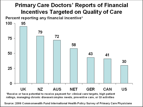 The U.K. stands out as a leader in providing payments for quality improvement: 95% of primary care doctors in the U.K. report receiving or having the potential to receive financial incentives for efforts to improve performance.