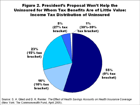 Nor would the president's proposal likely help those who are currently uninsured. According to the U.S. Treasury Department, some 3 to 5 million of the 47 million uninsured Americans could gain coverage. About 95 percent of the uninsured would not benefit substantially from the tax deductions. As described in a 2005 Commonwealth Fund report by Sherry Glied and her colleagues, more than 55 percent of the uninsured have such low incomes that they pay no taxes, while another 40 percent are in the 10 to 15 percent tax bracket.