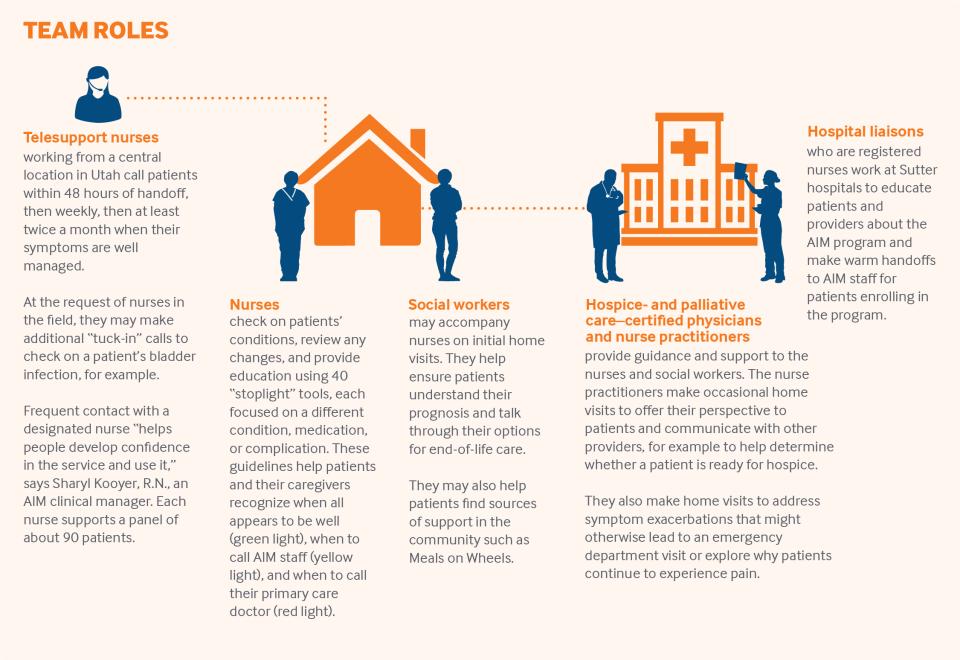 AIM currently serves some 2,700 patients a day. Common conditions include heart failure, cancer, chronic obstructive pulmonary disease, end-stage renal disease, and end-stage neural disease. Patients can be referred by providers at Sutter’s hospitals; about half enter the program that way. The rest are referred by primary or specialty care physicians or home health and hospice providers. They can be any age and have any type of insurance coverage as long as they are patients of a Sutter-affiliated clinician. When referring, physicians attest that their patients have an irreversible disease and they “would not be surprised if they died in the next 12 months” — language that AIM leaders say is vague enough to accommodate uncertainty but clear enough to identify appropriate patients.4 To be eligible, patients must also meet at least one of the following criteria: