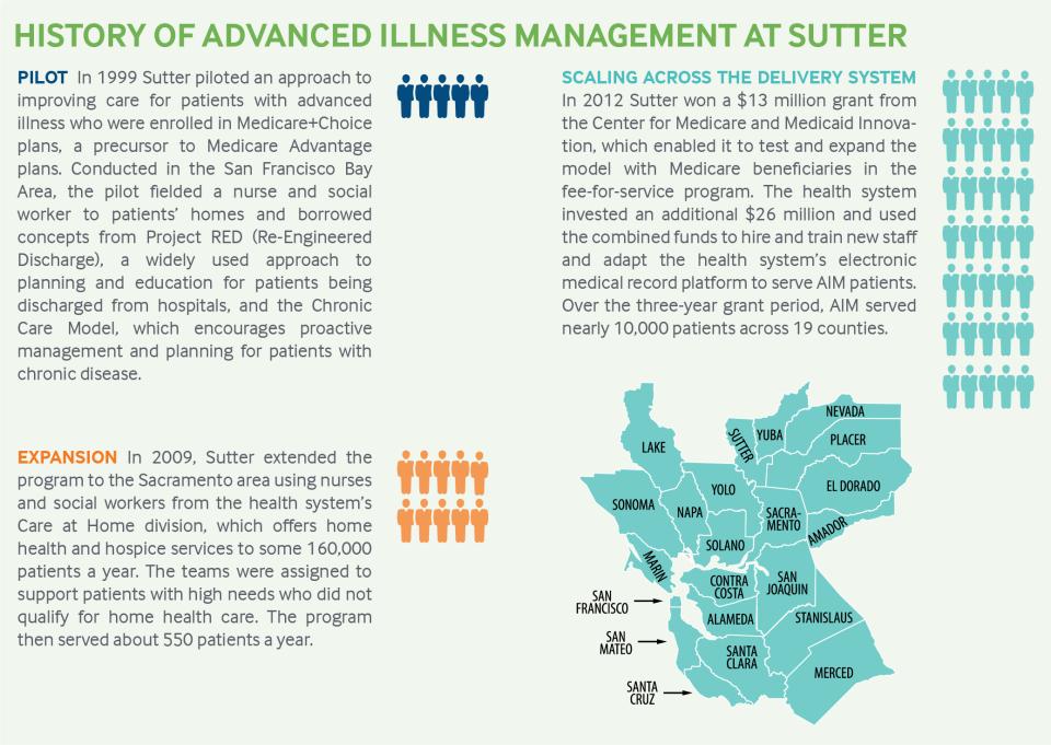 This case study focuses on the development and effects of AIM at Sutter, which has more than 5,000 affiliated physicians and 24 hospitals across Northern California. The health system is working to spread its approach to advanced illness care across the organization by training staff in primary care, specialty care, and emergency department and hospital settings to identify and refer patients to the program.