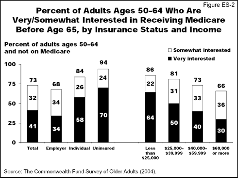 - Nearly three-fourths (73%) of adults ages 50 to 64 said they would be very or somewhat interested in receiving Medicare before age 65. Majorities of older adults across the income spectrum expressed support for this option (Figure ES-2). A majority would be willing to pay at least a small premium to participate but the benefit would likely have to be subsidized to facilitate participation.