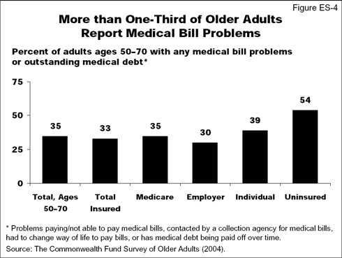 - More than one-third (35%) of older adults either had a problem paying their medical bills in the last 12 months or were paying off medical debt they had accrued over the last three years. Medical bill problems included having difficulty or not being able to pay bills, being contacted by a collection agency concerning outstanding bills, or making significant life changes in order to pay bills. Those who were uninsured, purchased coverage on the individual market, or had Medicare had the highest rates of problems (Figure ES-4).