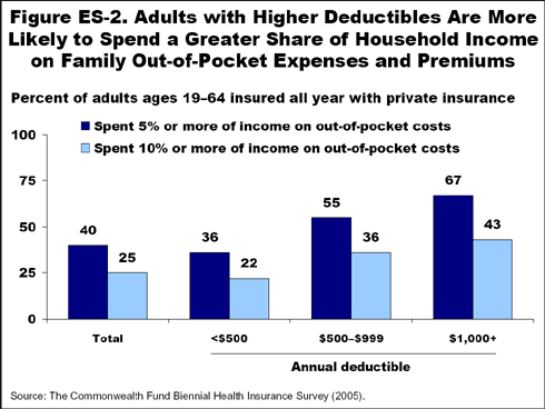 - Individuals covered by high-deductible plans—either through the individual insurance market or an employer—have financial burdens. Of those adults with per-person deductibles of $1,000 or more, two of five (43%) spent 10 percent or more of their incomes on premiums and family out-of-pocket medical expenses, compared with one of five (22%) of those enrolled in plans with deductibles of $500 or less.