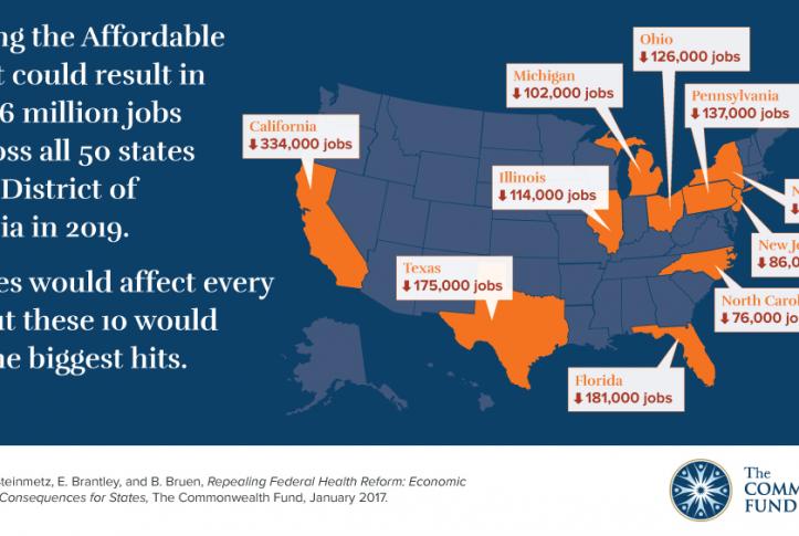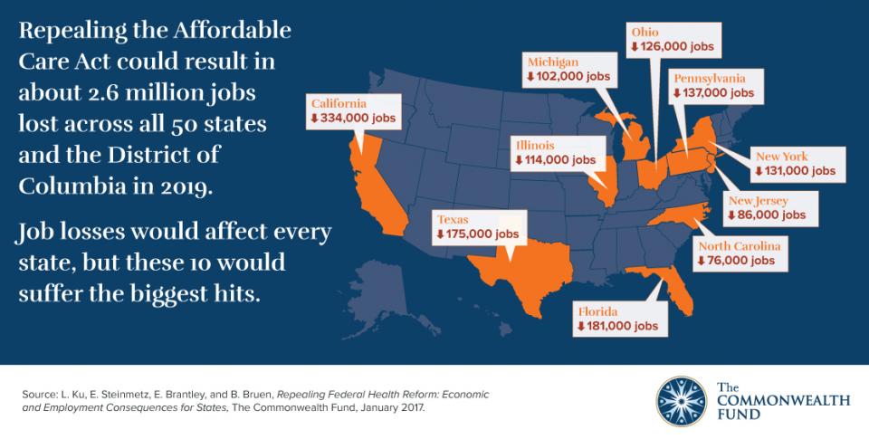 “Repealing the ACA Could Result in 2.6 Million Jobs Lost in 2019,” infographic, Commonwealth Fund, Jan. 10, 2017. https://doi.org/10.26099/w59f-vd63