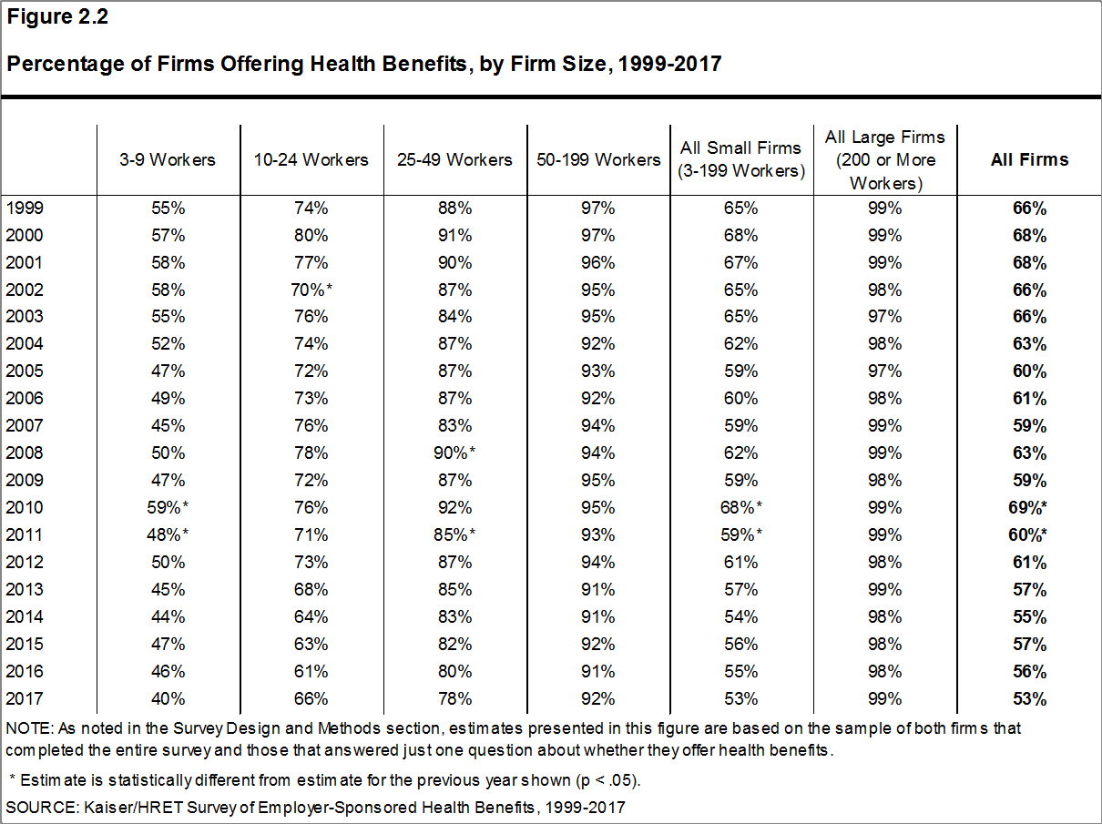 Comparisons in coverage from before and after the ACA show a decline in the rate of employers offering health coverage that began well before the passage of the law. According to the Kaiser Family Foundation, the percentage of firms offering employer-sponsored health coverage decreased from 66 percent in 1999 to 59 percent in 2009, the year before the ACA was passed. For firms with three to 199 workers, this amounts to an average annual decrease in coverage of 0.6 percent.18