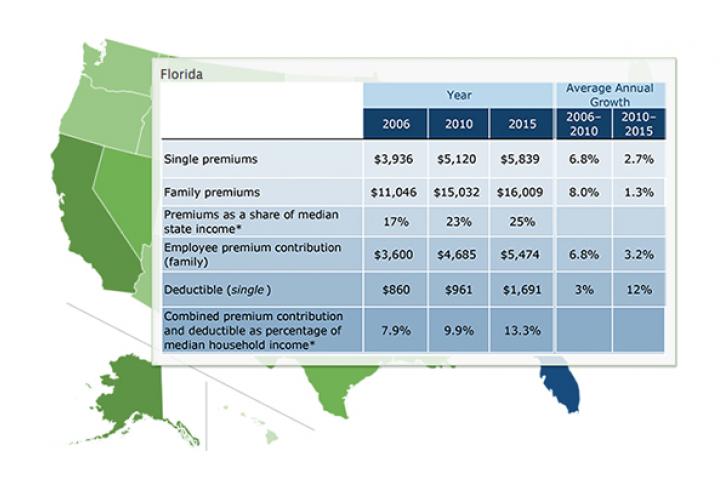 Data: 2006, 2010, 2014, 2015 Medical Expenditure Panel Survey–Insurance Component (for premiums, employee premium contributions, and deductibles); 2006–07, 2010–11, and 2015–16 Current Population Surveys (for median household incomes for under-65 population).