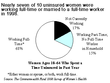 Employment is no guarantee of health insurance coverage. Indeed, most uninsured women are part of a family with at least one full-time worker. Fifteen percent of uninsured women are in families with at least one-part time worker and no full-time worker. Less than one-fifth of uninsured women are in families in which no one is currently working.
