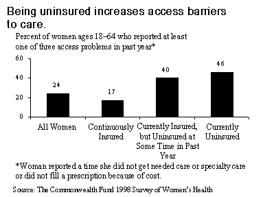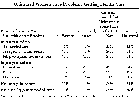 The survey documents the importance of insurance for access to care. Women who have been uninsured are significantly more likely to face difficulties getting care than women who are able to maintain continuous coverage. Compared with continuously insured women, those who experienced a time uninsured were about three times as likely to have access problems in the past year.