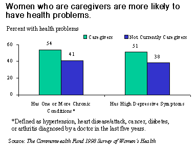 The Commonwealth Fund 1998 Survey of Women's Health probed the extent of women's caregiving roles, enabling comparisons by income, health, and access to health care. The survey finds that although women across all income groups are almost as likely to fill a caregiving role, lower-income caregivers are less likely to have opportunities for a respite from their responsibilities. Overall, women caregivers themselves are often in need of care: they report relatively high rates of poor health, disability, and depression.