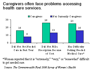 Perhaps because of the significant time and expense that caring for others demands, women caregivers are also at risk for encountering barriers to health care. Compared with other women, caregivers were twice as likely in the past year to not get needed medical care (16% vs. 8%) and not fill a prescription because of the cost (26% vs. 13%). One-quarter (25%) of women who were caregivers has difficulty getting medical care, versus one-sixth (16%) of other women.
