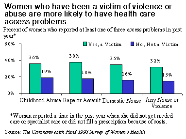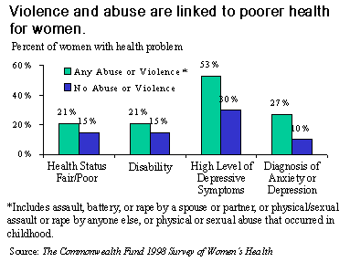 Violence and abuse rates during women's lifetimes remain disturbingly high and have long-term health effects, according to The Commonwealth Fund 1998 Survey of Women's Health. Based on women's reports of physical or sexual abuse as children, rape and assault, and physical abuse by a domestic partner, the survey finds that two of five women have experienced at least one type of abuse or violence in their lifetime. Those who had any indication of violence or abuse were at notably higher risk for physical and mental health problems.
